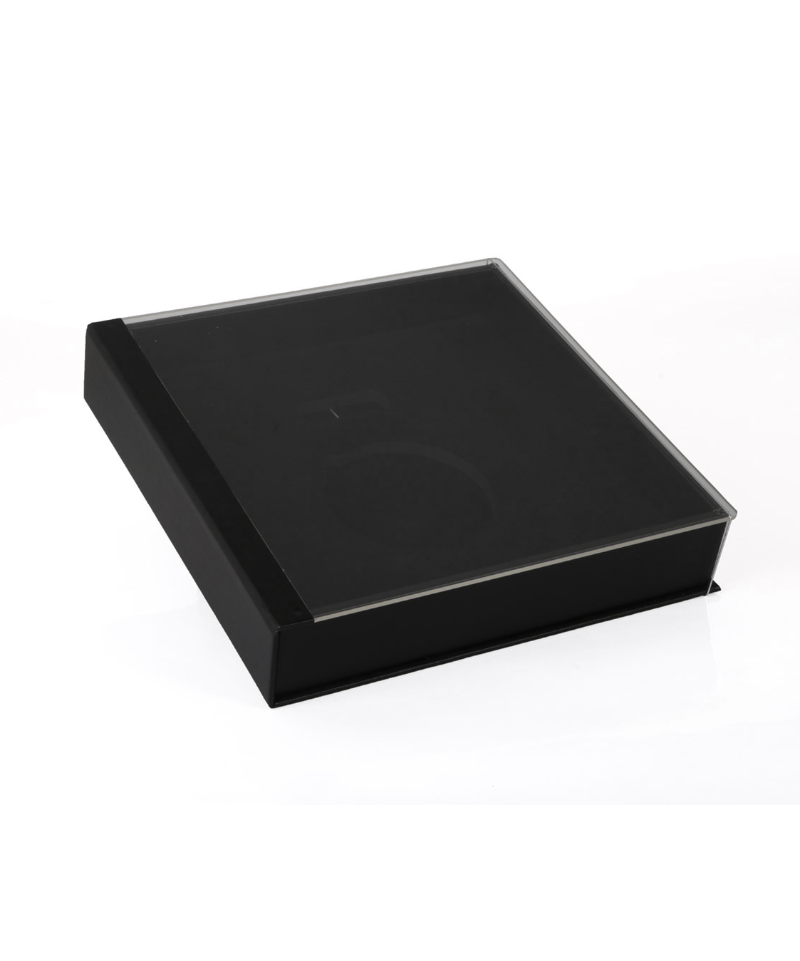 Tampa em Acrílico de 5 mm com fundo em Sintético e interior em veludo preto e fita de cetim.